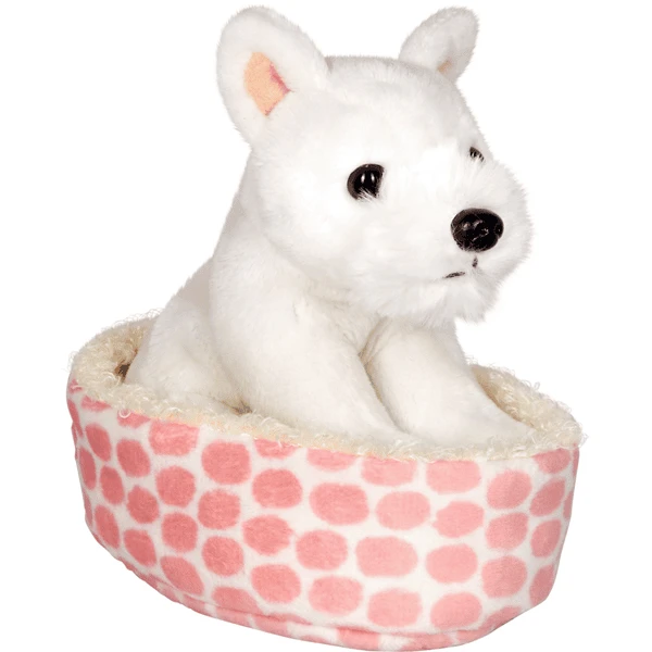 - Das kuschelweiche Hündchen hat weißes Fell und bringt einen gemütlichen Korb mit rosa Punkten mit